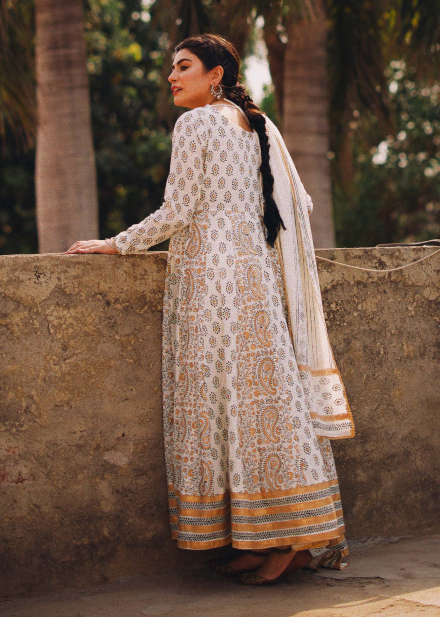 Effortless elegance – a white block-printed anarkali paired with a plain cotton churidar and a matching block-printed dupatta. Perfect for timeless charm.