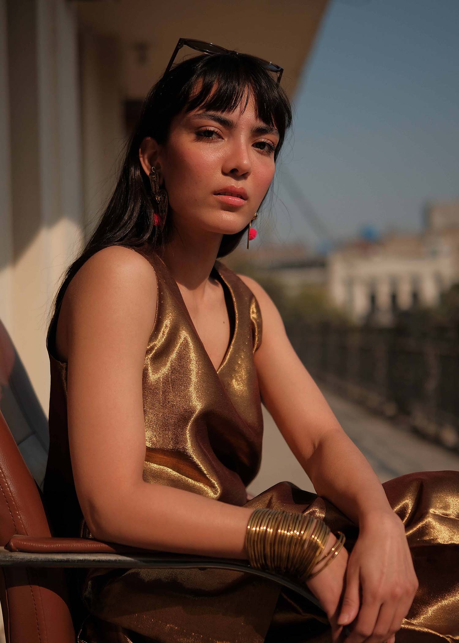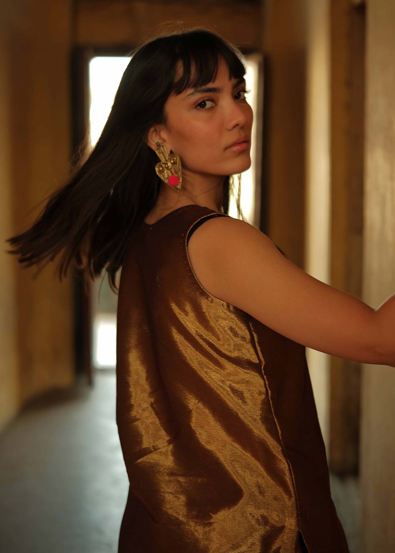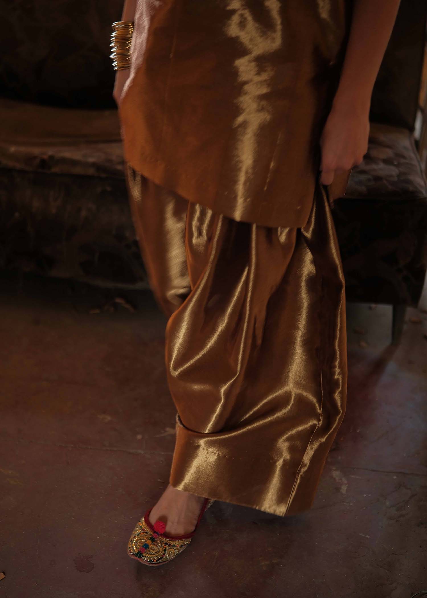 Crafted from luxurious pure tissue in a rich copper hue,the outfit brings together tradition and modern sophistication.Copper tissue short shirt paired with farshi shalwar.