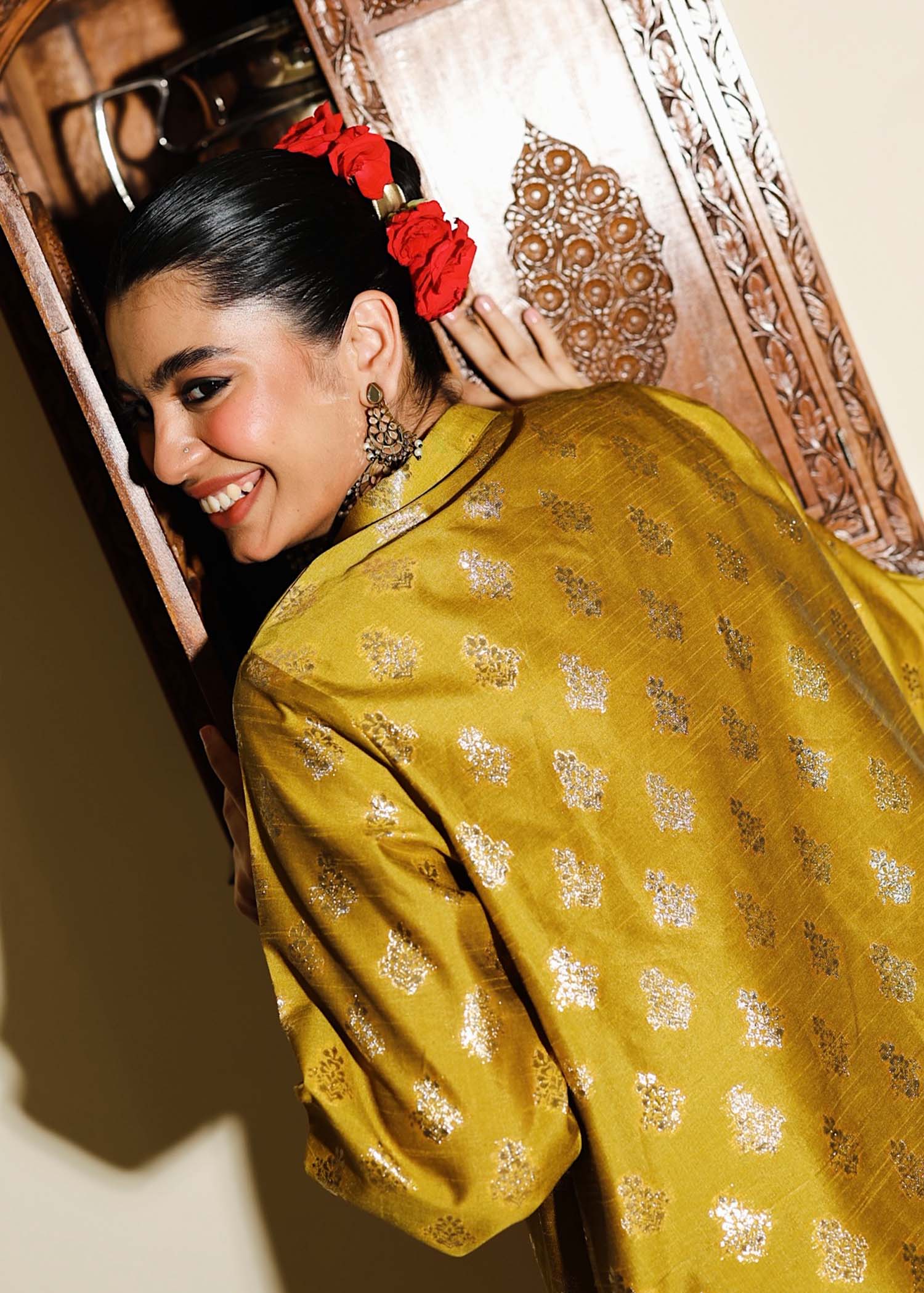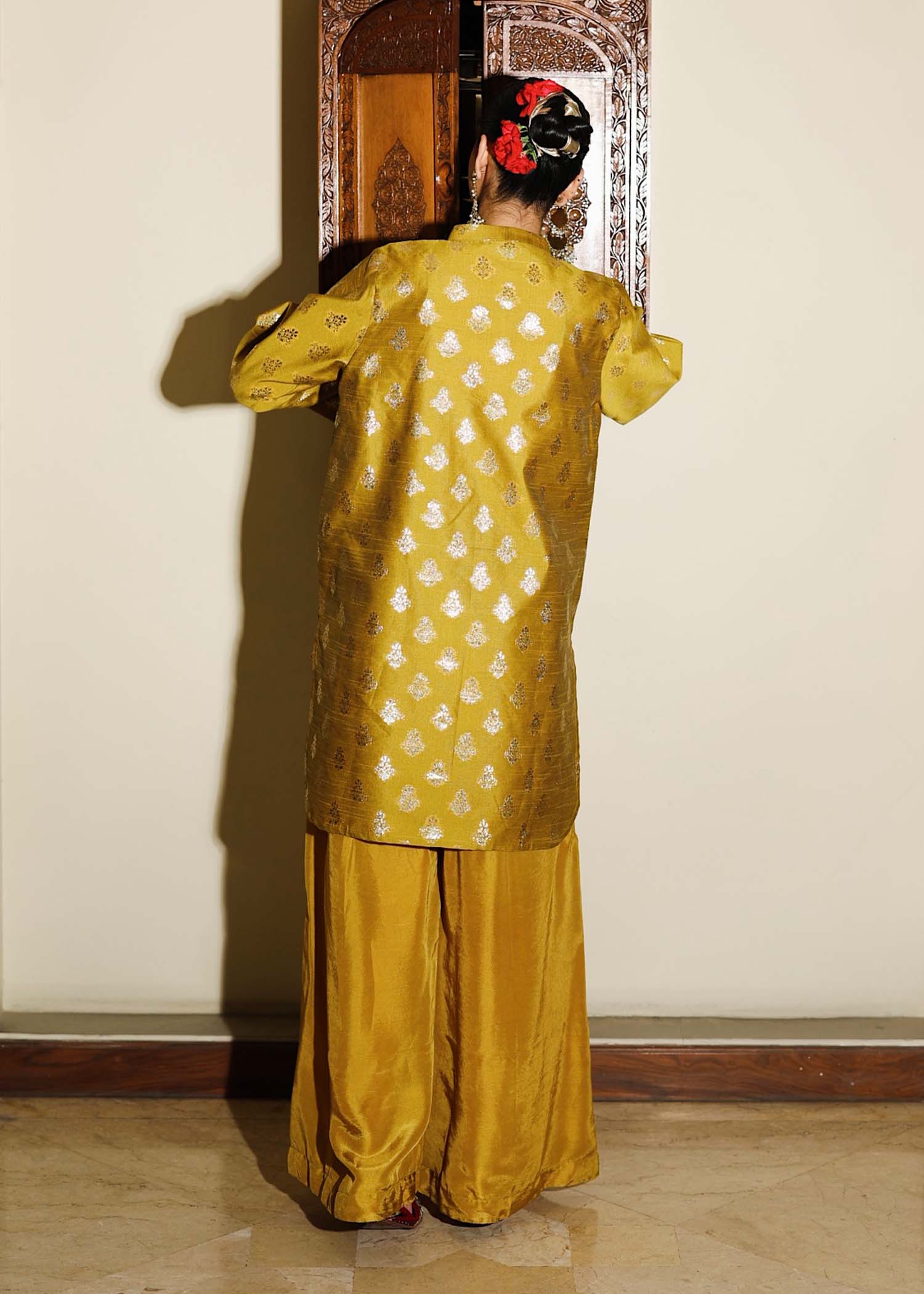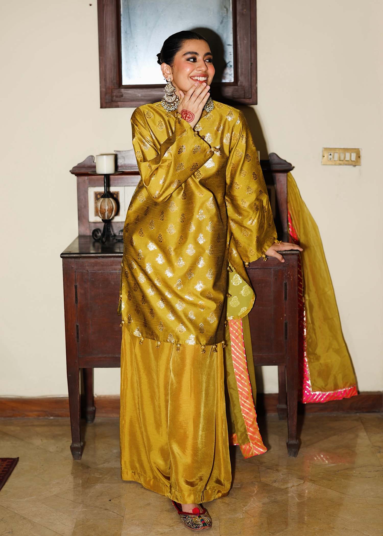 Mustard outfit featuring a Badlaa Zari shirt paired with pure silk trousers. The shirt with detailing on sleeve and border and is fully lined, ensuring comfort even for sensitive skin, and comes with an organza dupatta with pink border detailing.