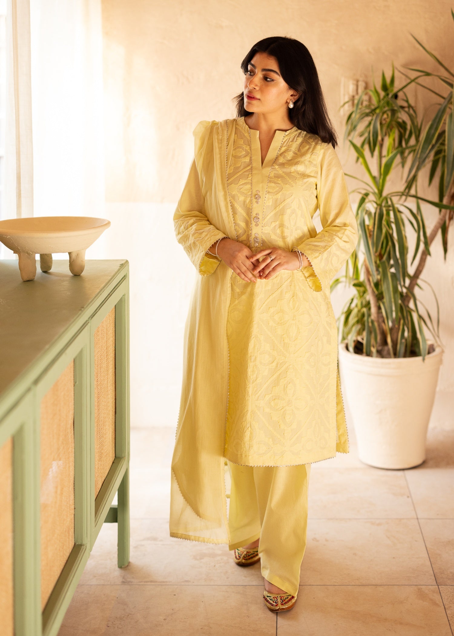 Pastel perfection – delicate Ralli work and silver gotta detailing on a pastel yellow shirt, paired with a matching shalwar for timeless elegance.