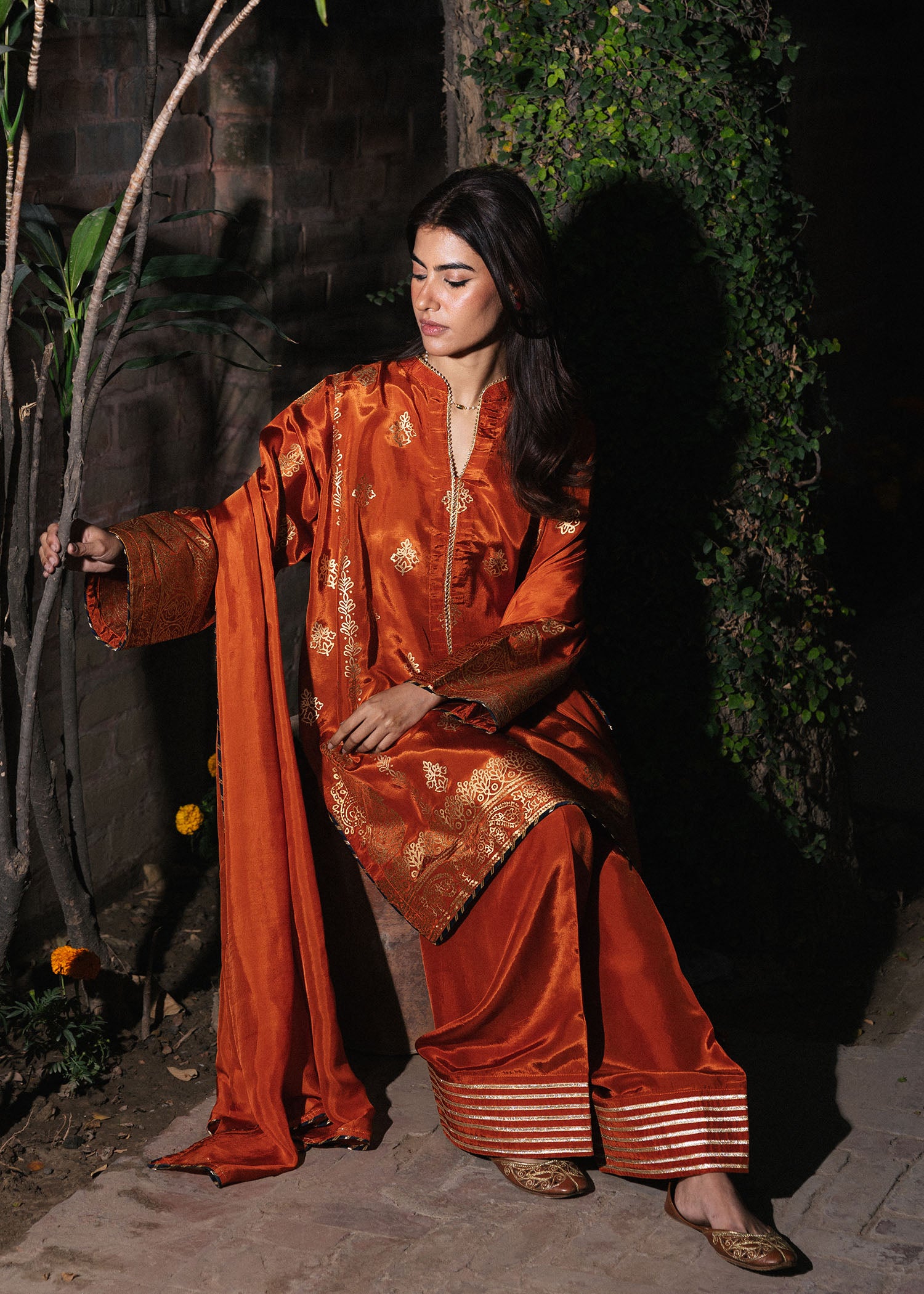 A celebration of understated luxury, Rust silk outfit is crafted from premium fabric and adorned with an exquisite gold block print that adds a timeless, regal charm with Gotti detailing on shalwar .The natural sheen of silk paired with the richness of gold detailing creates a refined silhouette that effortlessly transitions from day festivities to evening occasions.